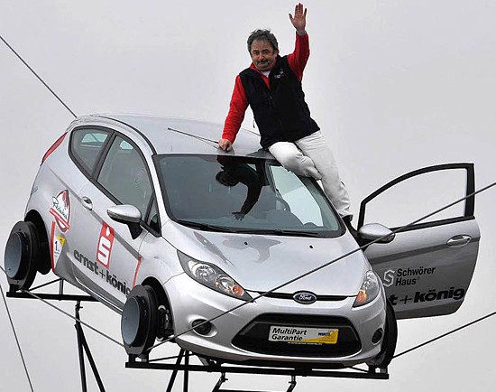 特拉伯今年57岁,在德国以从事钢丝冒险杂技著称。当天,他驾驶一辆普通的福特嘉年华轿车以37.4公里的时速在钢丝上行驶了120米。这一冒险之举创造了吉尼斯世界纪录,令在场观众惊诧不已。