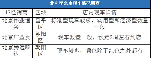 北斗星共有1.4L排量共5款车型可选,当然对于定位于入门级代步车的微型车来说,手动挡车型肯定是最热销的。北京地区共有3家昌河铃木汽车4S经销商,从调查结果来看,各家店内现车数量相差较大,不过大部分店内售价为4.89万元的标准型现车数量最为充裕,其他车型预订之后,预计2周左右即可到店,提车的周期还算是比较短。