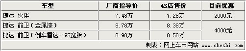 据4S店销售人员介绍:目前捷达最高优惠为4000元,各4S店内现车较充足。目前到的车辆颜色有白色、银色、灰色、黑色,基本上是捷达畅销的颜色,喜欢的朋友请与4S店联系。如购买非金属漆车辆,譬如白色,可以在厂商指导价上减少2000元。如消费者在店内做保险等一条龙服务,还可获赠脚垫、灭火器。