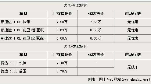 据北京一汽大众经销店销售人员介绍,大众全新捷达1.6L分为伙伴版以及前卫版两种车型,售价分别为7.58万元和8.88万元,由于前卫版白色车型采用的是普通漆油料,所以在厂商指导价方面会比前卫版其他颜色车型便宜2500元,售价为8.63万元。销售人员还介绍,老款的大众捷达已经没有现车,消费者已经无法购买到。