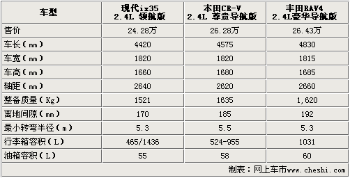 提起SUV车型,消费者马上会想到宽大的车内空间、出色的通过性、丰富的车内配置和大排量等,在国内市场上,SUV车型的销量也在不断的增长。2010年4月8日,北京现代ix35正式上市销售,其价格区间覆盖16.98万-24.28万,分别搭载了2.0L、2.4L两种排量,并提供2WD、4WD两种驱动模式的车型。那么这款车的市场竞争力如何呢?下面我们将选取目前在国内市场上热销的东风本田CR-V和一汽丰田RAV4的顶配车型与ix35进行对比,希望能为您的购车提供帮助。