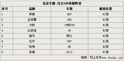 这其中,吉利帝豪品牌有EX7、GX5两款SUV推出,而比亚迪S6也终于将在车展亮相,海马骑士将在车展正式上市,北汽集团将推出自主SUV-007,长城汽车依托原有越野车领域的优势,将在车展推出高端SUV车型H6,这8款SUV车型从小到大,涵盖了从城市到越野SUV的不同类型车款,满足消费者的个性需求。
