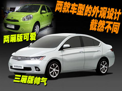 日产三厢版March和北京车展上日产展出的两厢版March,在外观设计上有着本质的区别。三厢版March脸的风格与两厢版车型的可爱感觉完全不同,甚至与现在的日产任何一款车型设计风格也都不相似。但仔细看下来三厢版March的进气格栅还是具有家族特征的。
