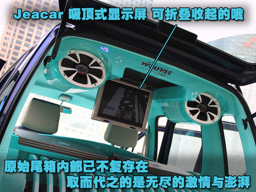 既然是叫做炫酷之旅,现在我们已经看到了足够的酷,马上要看到的就是无尽的炫。尾箱盖内侧藏着三个不见天日的设备,红蓝两块很像警灯?没错,它们带来的效果就是红蓝爆闪。至于中间不起眼的小圆孔能为我们带来什么,看看上面两张小图便不得而知。夜晚打开它,可以为我们呈现很多种斑斓的色彩,在任何地方,打开音乐,在炫丽灯光的环绕下,哪里都可以变成舞台。