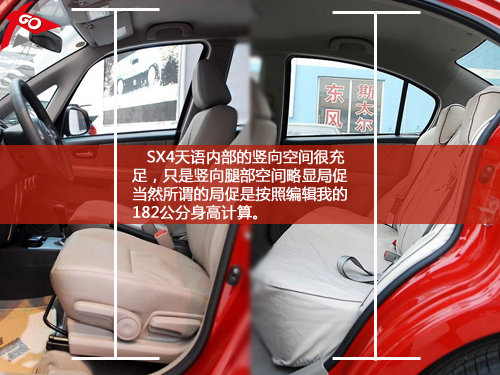 既然是跨界与SUV,那么想当然的天语一定会有SUV的一大特点,即是相对于轿车更加宽大的车内空间,而在天语SX4的内部,如果你的身高不高于180cm的话,那么天语完全可以给你很不错的车内空间享受,只是其内部乘坐感受硬邦邦的,比如内饰材质以及座椅与身体接触的感觉等等,缺少了很多轿车应有的乘坐舒适性。