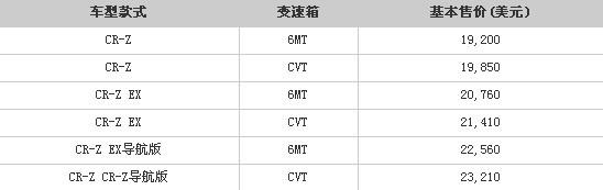 基本型CR-Z的配置包括了AM/FM收音机、CD和USB接口的音响系统、自动空调、电动车窗、智能无钥匙进入和定速巡航系统,总体来看配置已经算非常全面。如果增加额外的1560美元,就能在此基础上获得一套高级音响系统(拥有7个扬声器和一个低音炮)、蓝牙系统、真皮包裹方向盘等更高级的配置;从售价为22,560美元的CR-Z EX导航版开始都将配备具备语音控制的卫星导航系统。