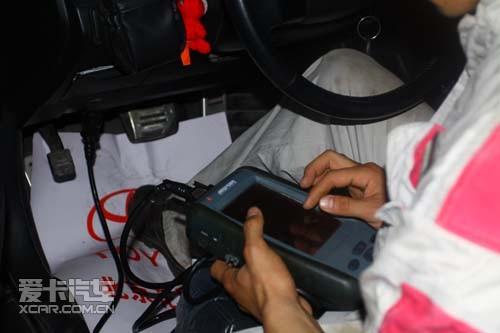 工人用仪器接入到行车电脑检测故障