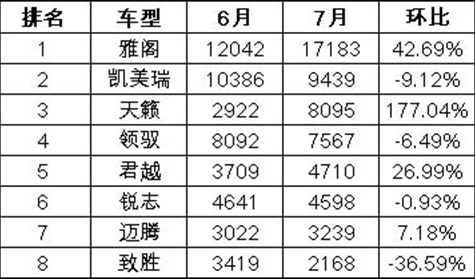 中高端车市的新雅阁、凯美瑞、新天籁分别销售17191、9439、8095台,新天籁第一次进入中高端车市前三名。新天籁7月能否盘踞季军宝座呢,目前只能用偶然来形容,一个月的成绩不应该说成是必然。新天籁之所以能挤进中高端车市前三名,不外乎两个方面:首先是企业强大的攻势,助推了新天籁上量;其次要多亏北京奥运带来的“奥运效应”,新天籁主要销售区域为华南市场,从而避开了奥运经济的主要辐射区,快速抓住了关键的华南广东市场,使销售获得了大突破。领驭作为一代名车,尽管车型略显老态,不过在消费者心中的地位不可取代,新天籁妄图取而代之还为时过早。