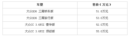 近日汽车探索从相关渠道获得消息,大众R36和CC车型进口后售价将在51.8万-55万元之间。目前展车已经到港,正在在等但相关手续,不日即将到店。北京多家进口大众经销商已经开始接受预订,定金1-3万元不等。
