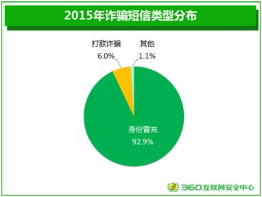360互联网安全中心数据显示,在2015年全年用户举报的各类诈骗短信中,近93%均为身份冒充类诈骗短信。其中,银行成为各位“演技派”们最爱模仿的对象,占比高达58.1%,堪称诈骗短信界的“LV尖货”;其次则是冒充电信运行商类,占比40.1%;同时上榜的还有冒充互联网公司类、冒充航空公司类和冒充公检法机构类诈骗短信。