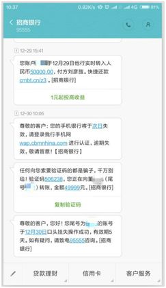 不久前,刘先生收到一条来自“95555”的银行短信,“银行”表示刘先生的银行卡即将失效,需登录手机网站进行认证。刘先生便按照要求登录网址,在其中填写了银行卡号、身份证号、电话等个人信息,同时将自己接收到的验证码也一同填入界面中。不料在界面提交了个人信息后,刘先生就收到了成功转账49999元的通知。