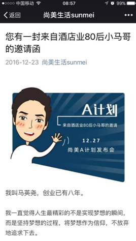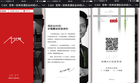 12月23日下午,“一封来自酒店业80后小马哥的邀请函”引起了行业内外的关注。这封极简风格的邀请函发布在尚美生活集团的官方微信公众号上,包括时间地点在内一共只有短短的不到400个字,却宣告了一场邀请方神秘、主题神秘、嘉宾神秘、流程神秘的“A计划”发布会,即将于2016年12月27日10:30在北京昆仑饭店召开。
