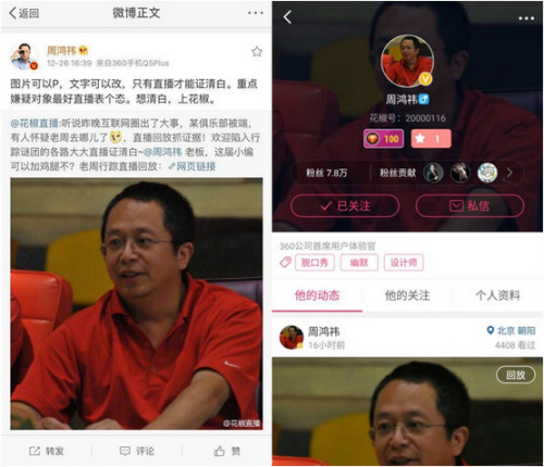 周鸿祎发微博辟谣 力劝中枪他人上花椒证清白