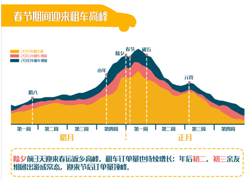 就以往数据而言,除夕的前3天是返乡高峰,也是节前租车订单的高峰期;而初二初三将迎来节后春运旅行高峰,用户在此阶段还需更早做准备。