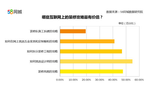 数据显示,在搜索装修攻略的过程中,业主们对网络上的各种装修信息有着不同程度的“偏爱”。47.58%的人认为装修风格的攻略比较有价值;54.77%的人认为如何挑选装修设计师或装修公司的工作最有用;46.84%认为如何拆分装修工程给包工队的攻略更有价值,可以直接用;41.14%的人认为在网上挑选五金家具和定制橱柜的攻略最有用;19.45%的人认为装修队施工、拆建攻略最有价值。