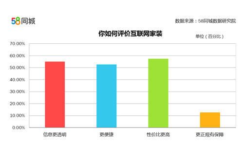 在对互联网家装的认识上,透明度高、便捷性强、性价比高,这三个互联网家装的最大优势已经得到了广大业主的肯定。对比传统装修,55.02%的业主认为互联网家装信息更透明,52.66%的业主认为互联网家装更便捷,57.5%的用户认为互联网家装性价比更高。