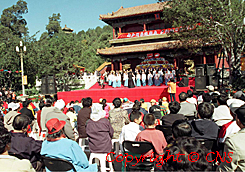 北京民众二日在景山公园参加国庆游园活动时,观看各文艺团体的精彩演出,欢渡国庆节假日。