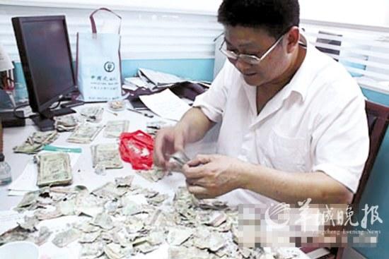 上周四,他提着一包破碎的纸币来到中国农业银行上塘支行,希望兑换。该行办理兑换工作的计划财务部工作人员叶青松看到破纸币后,一时不知所措。根据人民币兑换制度规定,只有部分残缺(纸币面积留存达50%以上)的人民币才可以兑换,但眼前的一堆纸币,大多已腐烂,支离破碎,没有一张是完整的,甚至有的纸币一触即碎。纸币从袋子倒出来时,在桌子上留下了一层纸币的粉末。