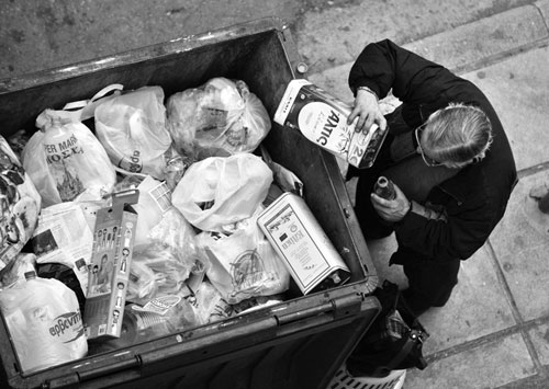 图为希腊北部城市塞萨洛尼基,一名男子从垃圾箱里收集尚未用完的橄榄油。希腊慈善团体日前警告说,金融危机的影响仍在持续,更多的人变得贫穷和无家可归。