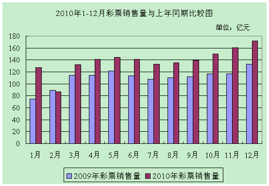 12月份,全国共销售彩票171.89亿元,比上年同期(简称“同比”)增加38.59亿元,增长29.0%。其中,福利彩票机构销售102.34亿元,同比增加27.28亿元,增长36.4%;体育彩票机构销售69.55亿元,同比增加11.31亿元,增长19.4%。