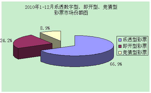 12月份,乐透数字型彩票销售108.22亿元[1],同比增加9.74亿元,增长9.9%;网点即开型彩票销售34.12亿元,同比增加10.09亿元,增长42.0%;中福在线即开型彩票销售12.34亿元,同比增加9.31亿元;竞猜型彩票销售17.22亿元,同比增加9.46亿元,增长121.9%。12月份乐透数字型、即开型和竞猜型彩票销售量分别占彩票销售总量的63.0%、27.0%、10.0%。