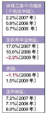 结果显示,在2007年金融危机爆发前,全球工资平均增速(不包括中国)为2.2%;而2008年和2009 年,工资增速分别降至0.8%和0.7%。