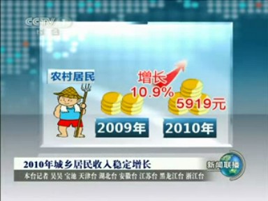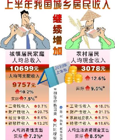 统计显示,2010年我国农村居民人均纯收入5919元,比上年增长14.9%,扣除价格因素实际增长10.9%;我国城镇居民全年人均可支配收入19109元,比上年增长11.3%,扣除价格因素实际增长7.8%。