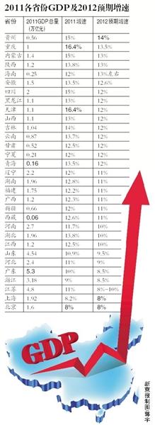 数据:从增速看,2012年GDP预期目标最高的为贵州,达到14%;最低的为上海、北京,均为8%。“西高东低”特点明显。在31个省份中,海南今年的目标为13%左右,高于去年12%的增速;北京、宁夏设定目标与去年持平,分别为8%和12%;其余省份则均有不同程度的降幅。