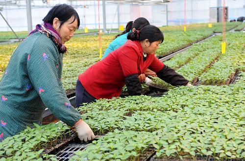 2月22日,在白马国家农业科技园区内由江苏省农科院建立的“高效园艺作物种子种苗产业化示范基地”,几名农民在育苗玻璃温室里为苗床上的辣椒苗散苗。新华社记者孙参摄
