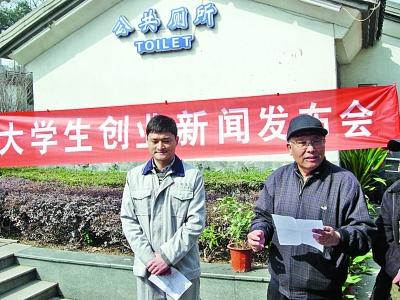 昨天上午十点,南京中央路北侧的一处公厕前挂出了一条写着“大学生创业新闻发布会”的横幅,发布会的主角就是韦亚余。然而在与小韦的交流中,记者意外得知,发起并主办此次新闻发布会的却并非小韦本人,而是一帮热心的南京市民。