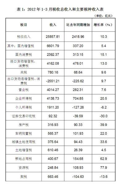 一季度税收收入增长的主要特点:一是税收总收入增速为近三年最低水平。延续去年四季度以来的低速增长态势,今年1-3月税收总收入增速比去年同期增速回落22.1个百分点,为近三年同期最低。二是个人所得税收入下降。1-3月个人所得税同比下降6.2%,比去年同期增速回落43.2个百分点。三是主体税种收入增速普遍回落。1-3月国内增值税、消费税、营业税和企业所得税同比分别增长5.4%、15.1%、7.6%和20.5%,比去年同期增速分别回落17.8、6.4、18.7和17.4个百分点。1-3月进口环节税收和关税同比分别增长13.0%和9.6%,比去年同期增速分别回落35.8和37.9个百分点。四是与房地产相关的税收收入增速大幅回落。1-3月契税、房地产营业税同比分别下降13.6%和17.5%,比去年同期增速分别回落41.1和45.8个百分点;土地增值税同比增长4.5%,比去年同期增速回落108.4个百分点。