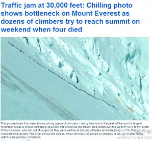 英国《每日邮报》拍摄的画面:登山者首尾相接连成一条线。网友王春蕾微博中透露:珠峰也出现拥堵。5月某天,珠峰海拔3000米左右处,由于路太狭窄,出现150人的拥堵状况,结果有四个人因被围困3个多小时,氧气耗尽,失去了生命。