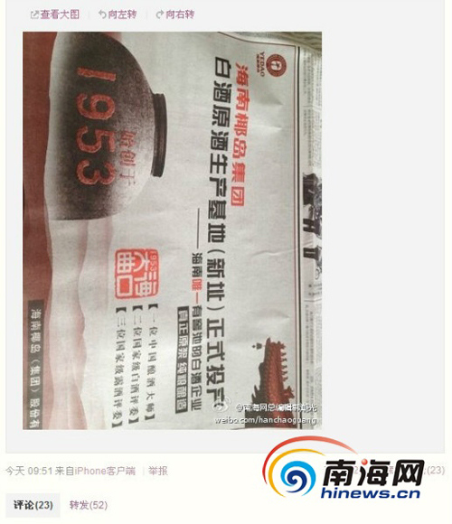 而这则“海南椰岛集团原酒生产基地(新址)正式投产”的广告一经刊登,也引来了众多新浪微博网友的议论,不少网友在微博上大呼“被忽悠”。网友“@海南-李超”在微博上气愤地说到,“拒绝忽悠的海南人却被忽悠了长长久久,谁之悲哀?海南岛上的居民们,当你仍在被朦朦胧胧安慰着的日子,你还爱此酒吗……”,而网友“@阿麦郎”则指出,“原来是这样,朋友来了有好酒,原来不是海南酒。这样一说,这个酒的地方特色也就是神话了。”截止记者发稿前,该条微博转发次数已达52次。