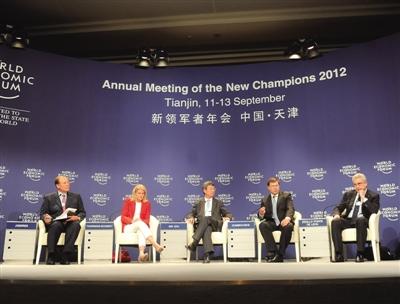 9月11日,2012年夏季达沃斯论坛在天津开幕,与会嘉宾围绕诸多议题展开讨论。图为在一场互动式会议上,与会嘉宾探讨了欧债危机现状、走势以及如何应对等问题。 本报记者 赵 晶摄