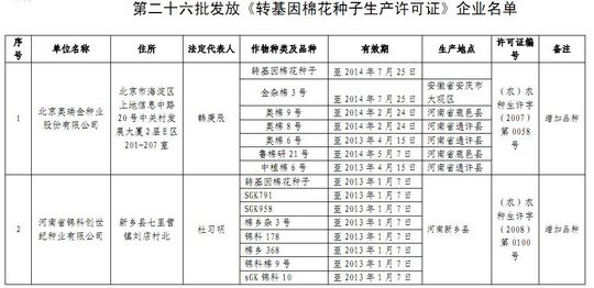 第二十六批发放《转基因棉花种子生产许可证》企业名单