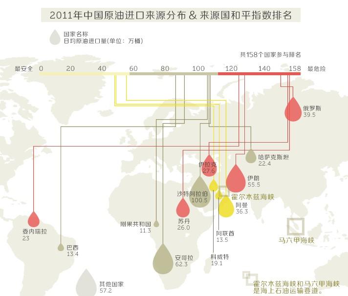 中国最重要的石油供给国大多集中在多是非的中东和非洲。从经济学人智库发布的2012年全球158个国家和地区的和平指数上看,中国的主要石油供应国大多排名靠后。在政治稳定性、有组织冲突和邻国关系这几项有可能影响能源出口的指标中,和平指数排名靠后的石油供应国都不同程度地存在问题。2011年到2012年,受北非政治动荡和苏丹问题的影响,中国在北非地区的能源利益受到了严重挑战,南苏丹甚至在2012年一度停产。另外为了应对国际社会对伊朗的制裁,中国从2012年开始被迫放缓了在伊朗的能源投资,并且大幅降低来自伊朗的石油进口量。