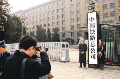 3月17日,人们在正式亮相的“中国铁路总公司”门牌旁留影。