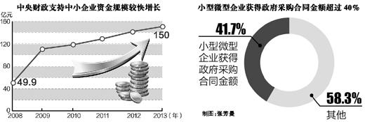 5月30日,记者从财政部获悉:中央财政支持中小企业资金规模实现较快增长,由2008年的49.9亿元增至2013年的约150亿元,6年增加了两倍。此外,2012年全国政府采购金额13900多亿元,小型和微型企业获得的合同金额5800多亿元,占40%以上。