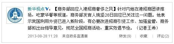 商务部回应入港招商奢侈之风:规范全国招商活动