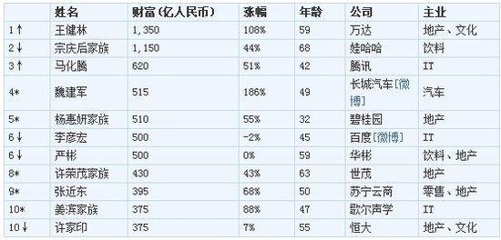 榜单显示,“地产大王”王健林以1,350亿财富首次成为中国首富,是胡润百富榜开创15年来诞生的第十位新首富,财富创历年新高。去年首富宗庆后家族今年财富1,150亿,虽比去年增长了44%,但退居第二。这是胡润百富榜有史以来第一次有2位企业家财富上千亿。