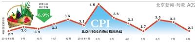 北京市统计局、国家统计局北京调查总队昨日发布数据显示,8月份北京居民消费价格指数(CPI)同比上涨2.7%,环比下降0.6个百分点。这也是在6月CPI冲上3.5%后,首次重回“2时代”。其中,鲜菜价格同比下降6.9%,降幅最为明显。