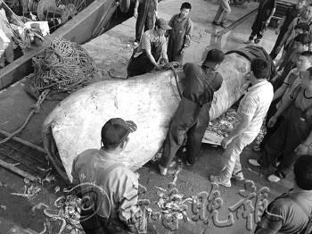 9月11日,重达3.52吨的鲸鲨被运上岸。通讯员 张志伟 摄