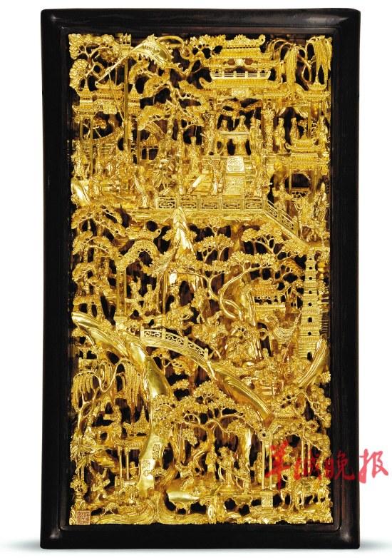 广州银通10月12日推出的“中国工艺美术大师李得浓金木雕作品专场”集中展示了潮州金漆木雕。李得浓告诉羊城晚报记者:“潮州木雕的题材内容有的借鉴舞台艺术,有的是民间喜闻乐见、有寓意的故事,也有起警示作用的典故。在有限的木板,场面不是很大的情况下,要把故事叙述完整,于是潮州木雕发明了一种‘之’字形的构图形式,行话称为‘径路’。”