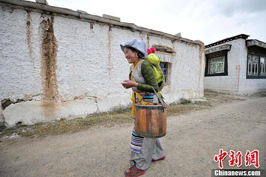 中新网拉萨10月17日电 (记者 唐朝杨)晚上6点,西藏的夜幕还未拉下,茨仁措姆很熟练的将5个月大的女儿捆在背上,而后拎起木桶,和母亲一起去家后面的山坡上完成一天中最重要的工作——挤牦牛奶。