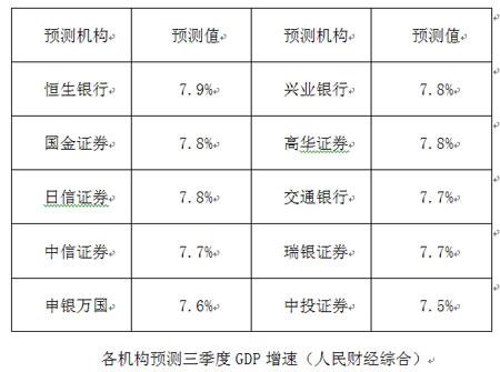 从预测来看,多数机构认为三季度经济增速将快于上半年。交通银行预计三季度GDP的环比增速将启稳回升,同比增速上升为7.7%左右。中信证券9月宏观数据前瞻报告也指出,今年第三季度,在稳增长政策作用下,需求有一定的回升,预计第三季度GDP增速为7.7%。