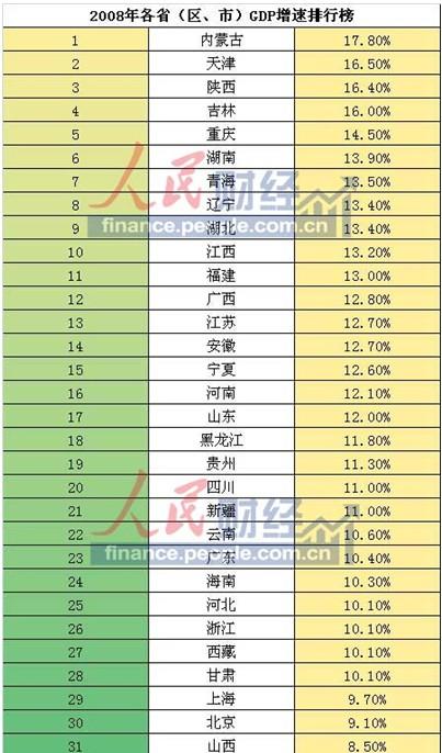 2008年GDP增速前五位分别为:内蒙古、天津、山西、吉林、重庆