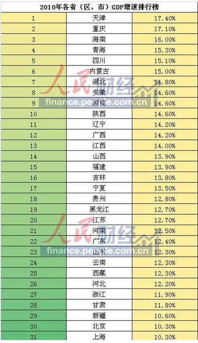 2010年GDP增速前五位分别为:天津、重庆、海南、青海、四川