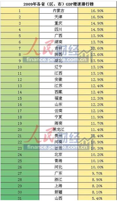 2009年GDP增速前五位分别为:内蒙古、天津、重庆、四川、广西