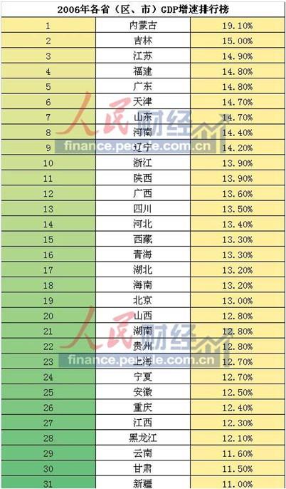 2006年GDP增速前五位分别为:内蒙古、吉林、江苏、福建、广东