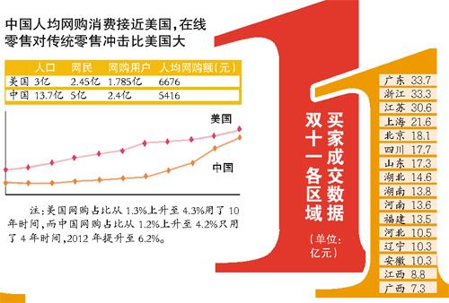 双十一爆炸性增长,使得今年在线零售占社会消费品零售总额有望接近10%,去年则超过6%,其威力开始显露。阿里巴巴一位人士说:“一般来说,低于5%的事情,还难以进入统计。但一旦占到社会消费品零售总额5%,就不同了,会越过临界点,呈现爆发之势,并开始产生全局影响,成为改变中国的零售业格局的起点。”